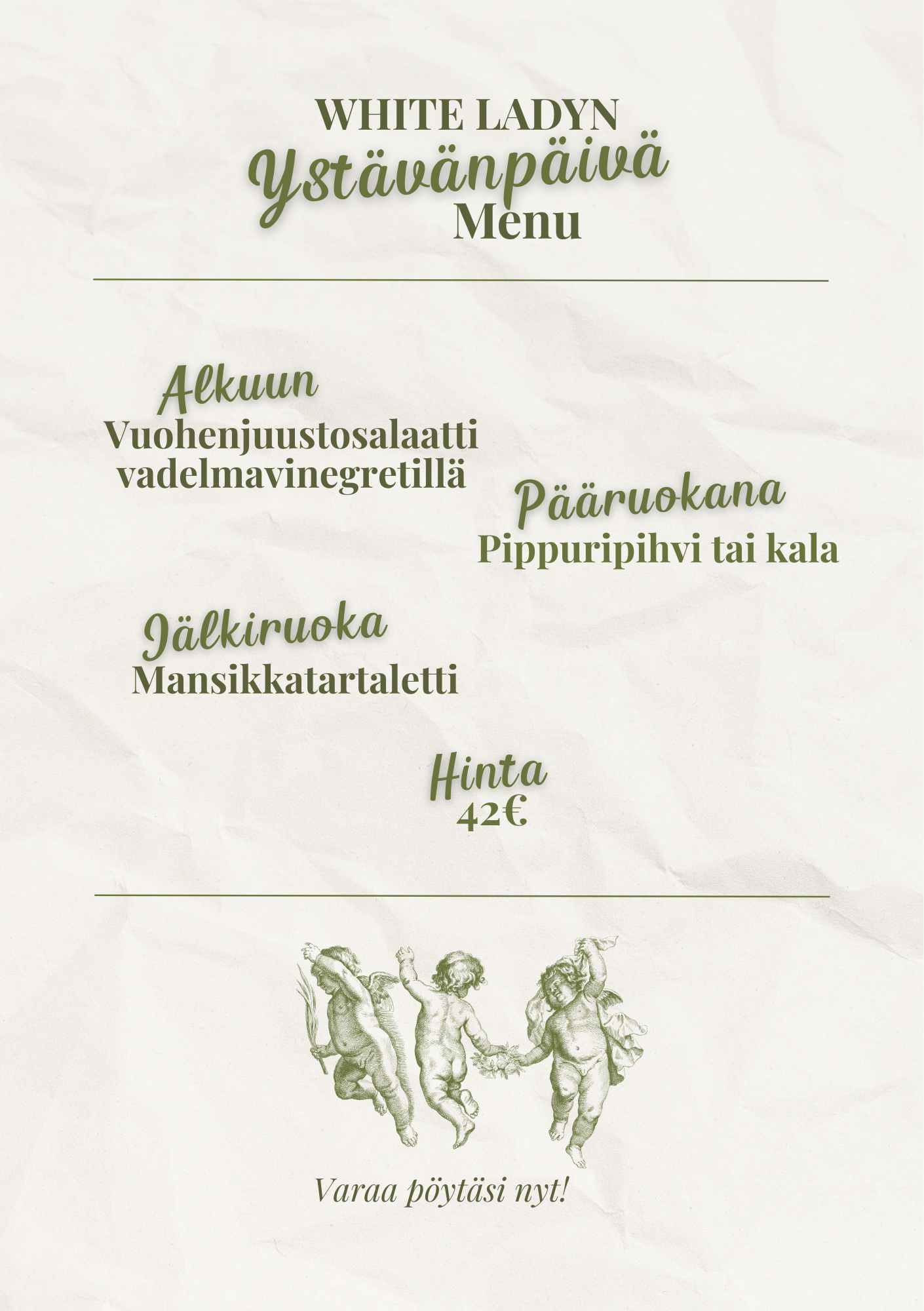Ystävänpäivänä 14.2 White Ladyssä on tarjolla herkullinen spesiaalimenu. Katso menu tästä! Tarjolla menu lisäksi myös a la cartemme – suosittelemme varaamaan pöydän.